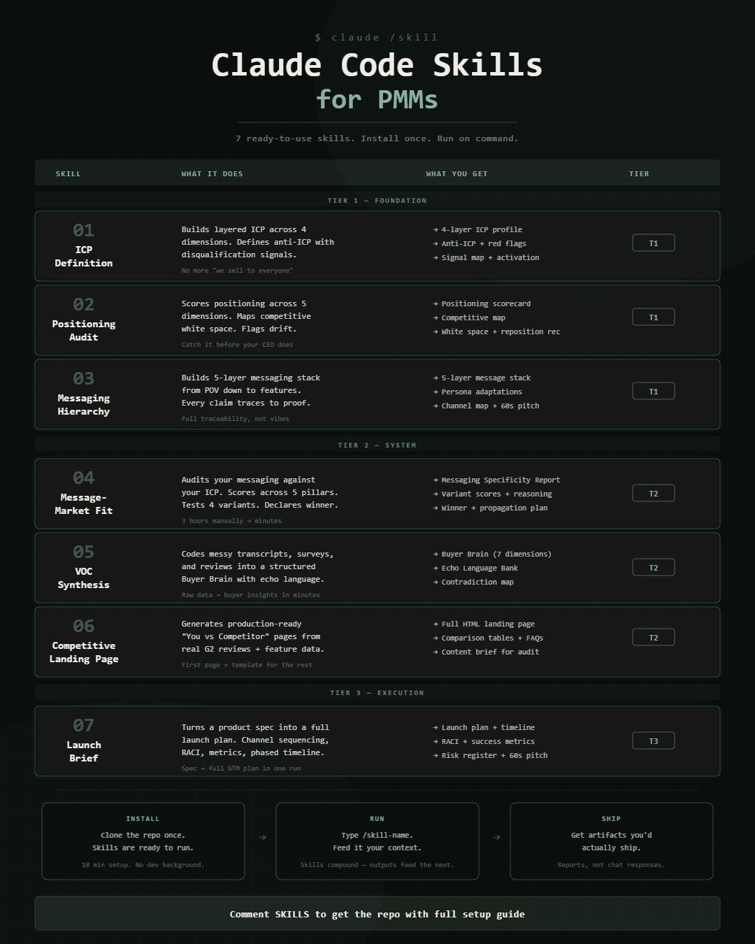 But right now? The skills are yours, no catch or paywall. I just got tired of watching other PMMs waste time on bad prompts or vanilla skills.
