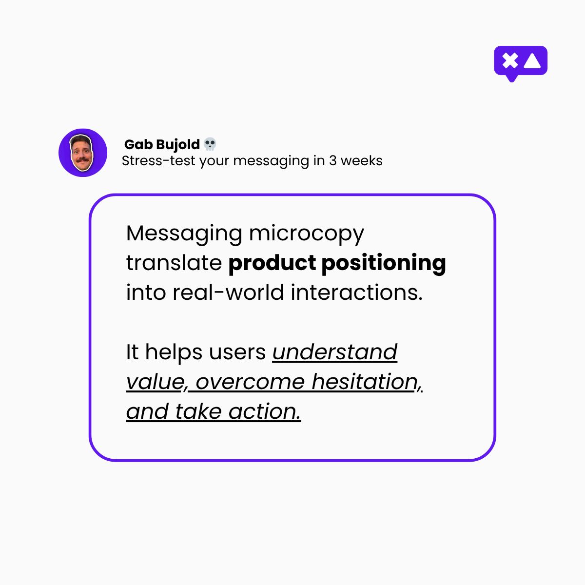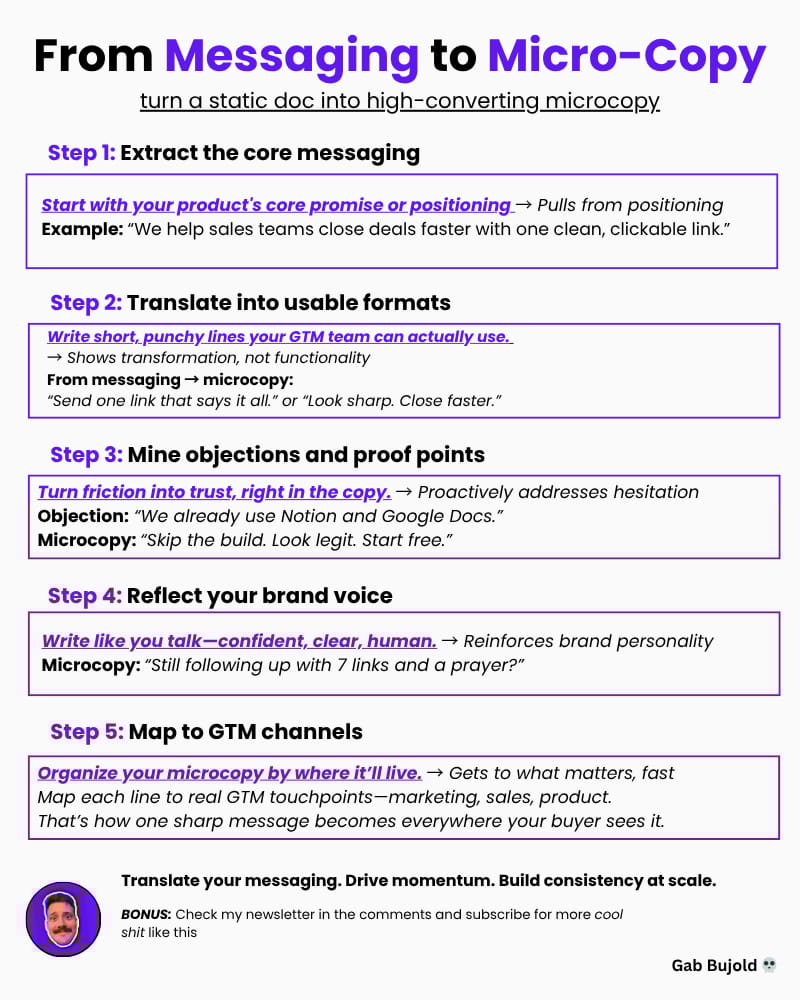 I grew tired of me structuring messaging properly, only to see it get destroyed by sales and founders, so I took an extra step and start writing messaging microcopy so people could at least get a proper starting point